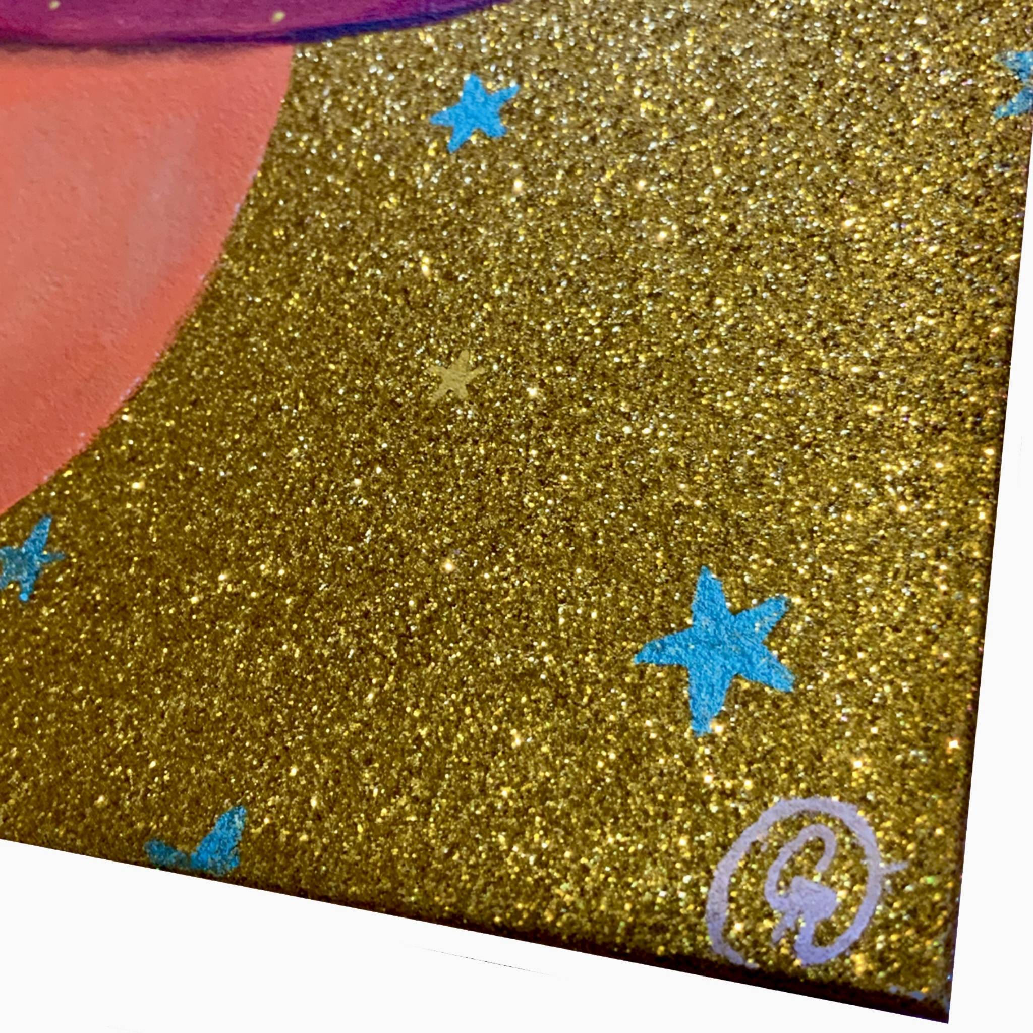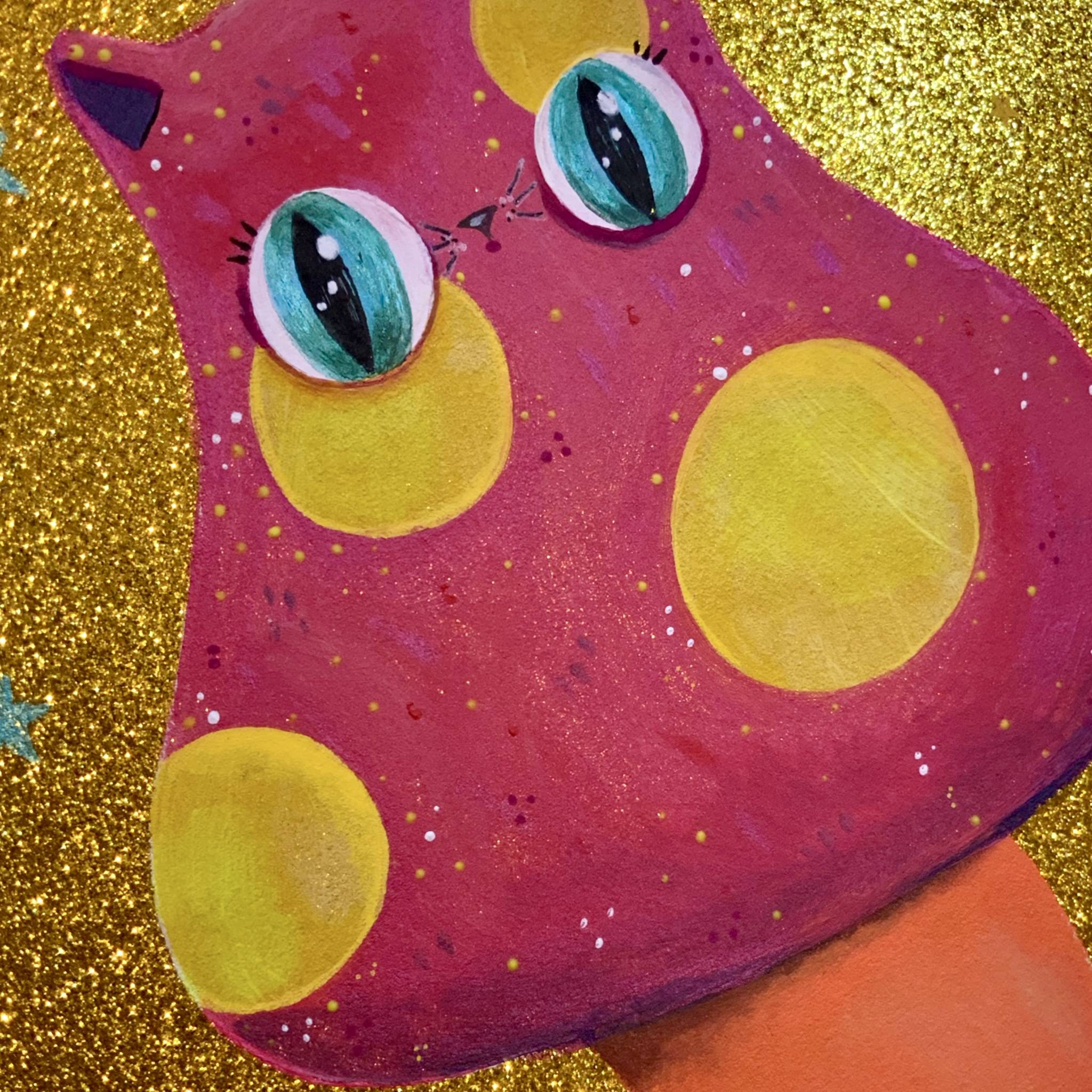 Titre : Le Chatpignon Cosmique Format : Toile cartonnée A4 (21 x 29,7 cm) Technique : Peinture acrylique sur fond pailleté Prix : 50,00 € (Hors frais de port)