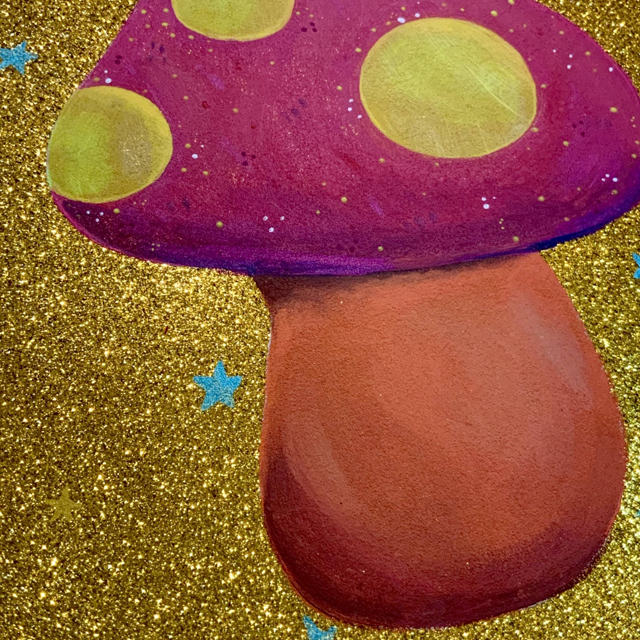 L’illustration présente un adorable chat-champignon aux grands yeux verts sur un fond spectaculaire recouvert de paillettes couleur or et d’étoiles turquoise. C’est l’ajout parfait pour les amoureux de l’art Pop, du style Kawaii, ou ceux qui cherchent une pièce de décoration murale vibrante et décalée.